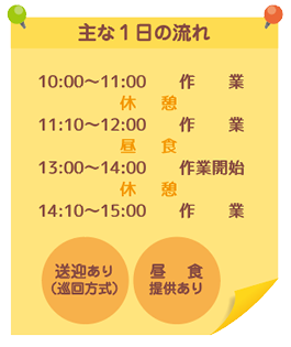 | 仕事内容 | ①福祉サポートスタッフとして障がい者さんのお仕事のお手伝いと指導、補助などを行います。 (調理補助・配膳・作業の補充・作業同行支援・送迎業務・簡単なお掃除・片付けなど) ②パソコンによる入力作業 (エクセル・ワードを使用した各種資料作成・入力作業) ※福祉施設内で関連するお仕事で、それぞれの出来る業務をお願いしております。 |